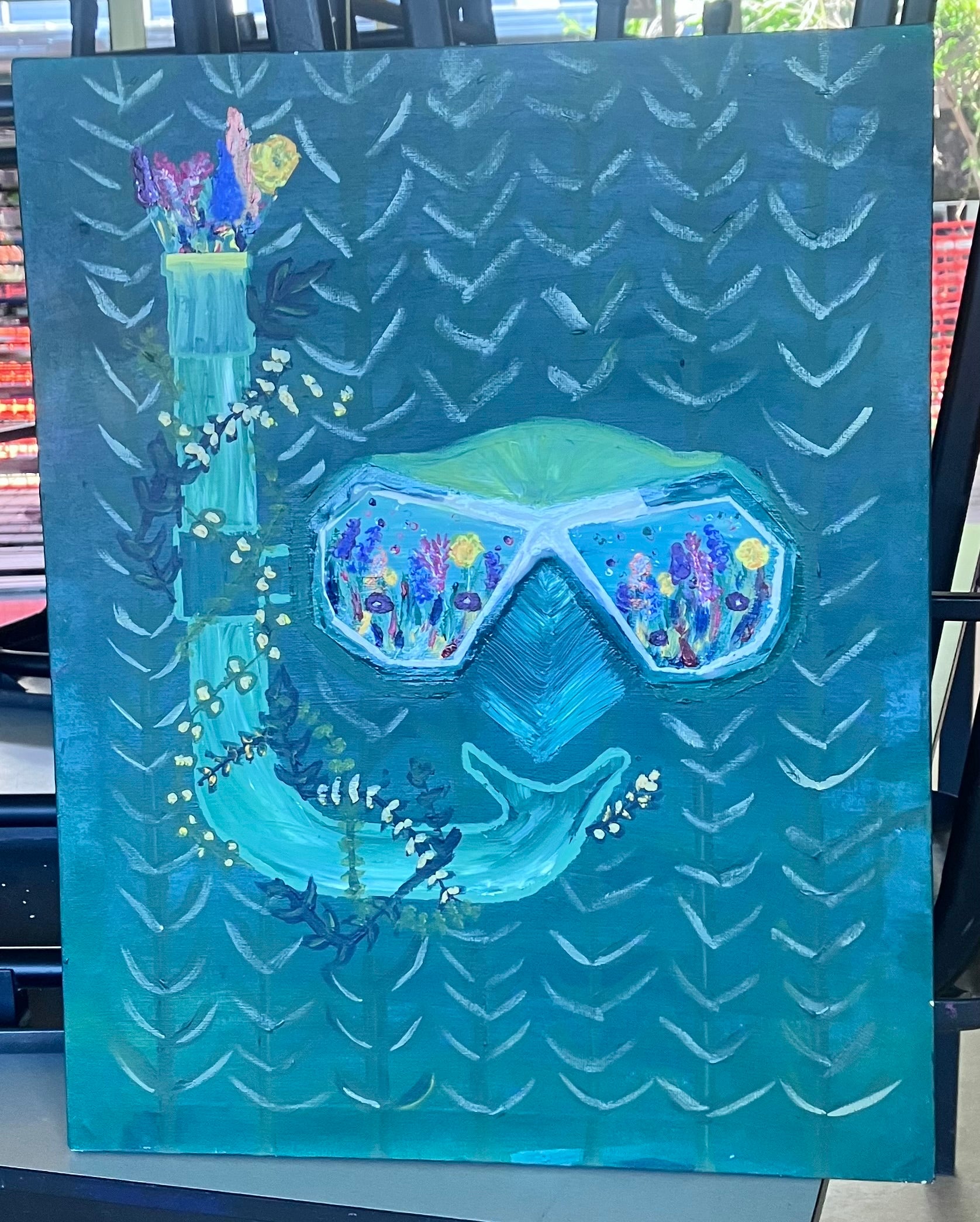 'Breathe' is a painting I did for a local hospital. Its message is that even during the hard times choose to see the good in life. The mask represents the choice and the flowers in the mask represent the good that you're choosing to see.